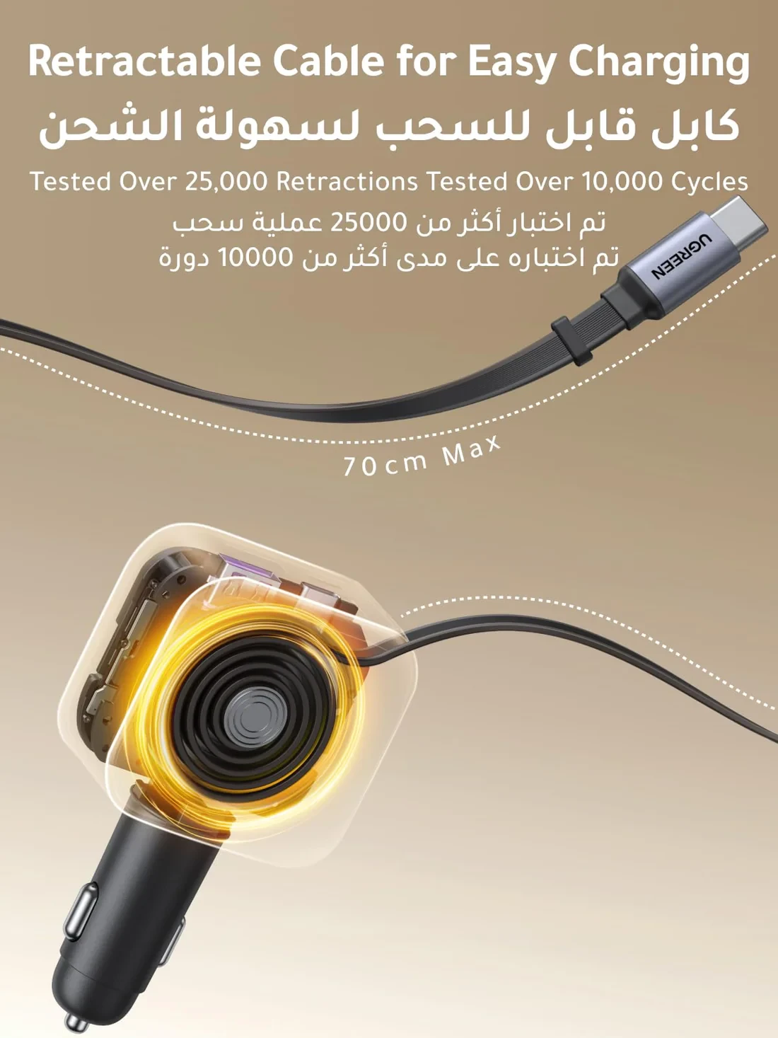 The 70 cm retractable USB-C cable extends smoothly when needed and retracts automatically when not in use. This helps prevent tangled cables and keeps your car interior clean and organized.