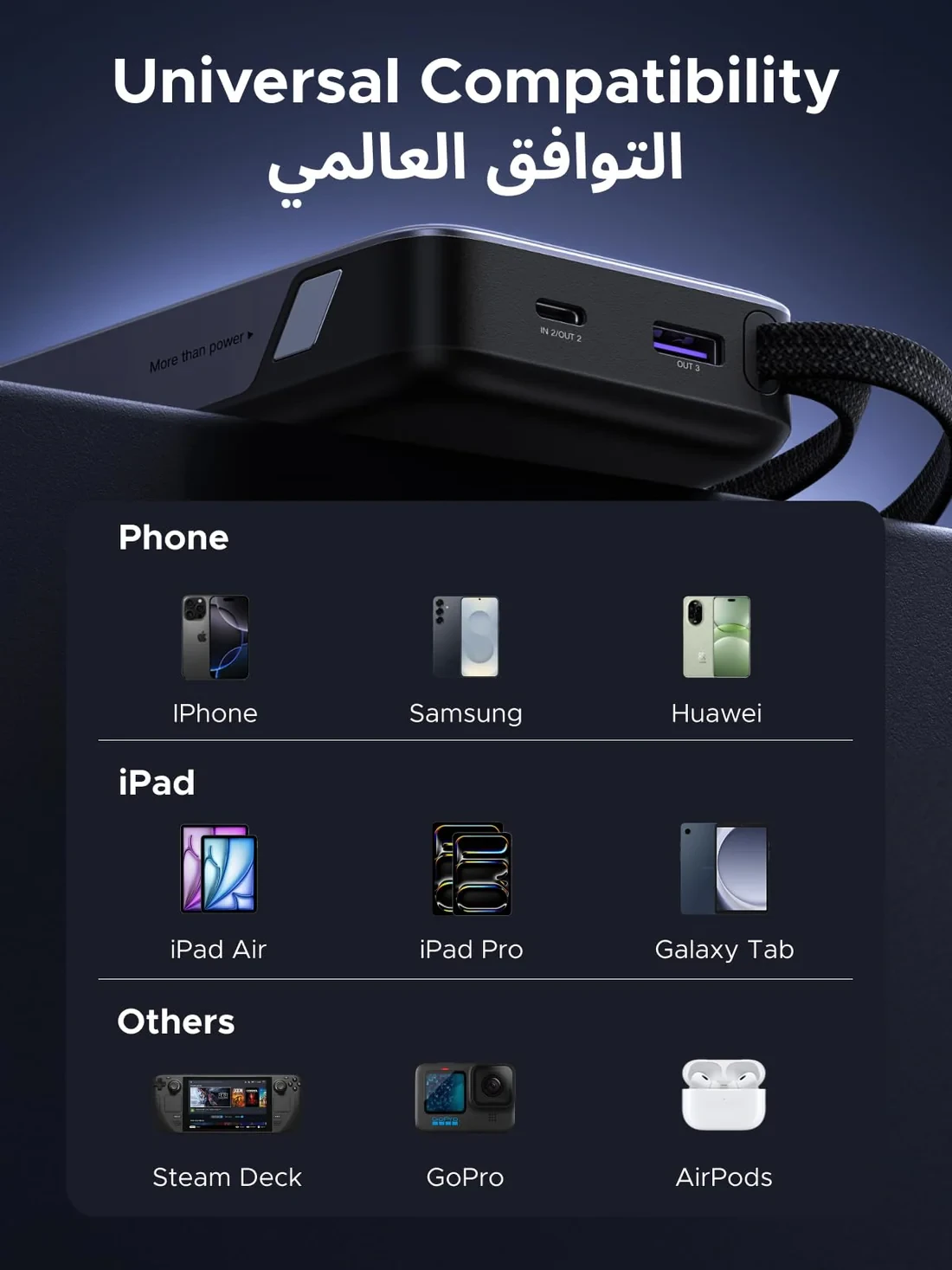 Equipped with 45W PPS and Power Delivery fast charging, the power bank delivers efficient power for a wide range of devices. It can rapidly charge smartphones and tablets while also providing reliable charging support for compatible laptops and USB-C devices.
