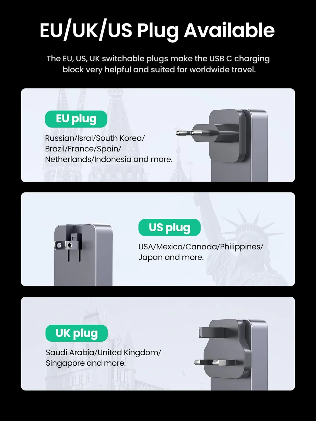 The 65W ultra-slim charger comes with a non-removable US plug and interchangeable UK/EU plugs, making it ideal for international travel without carrying multiple adapters.