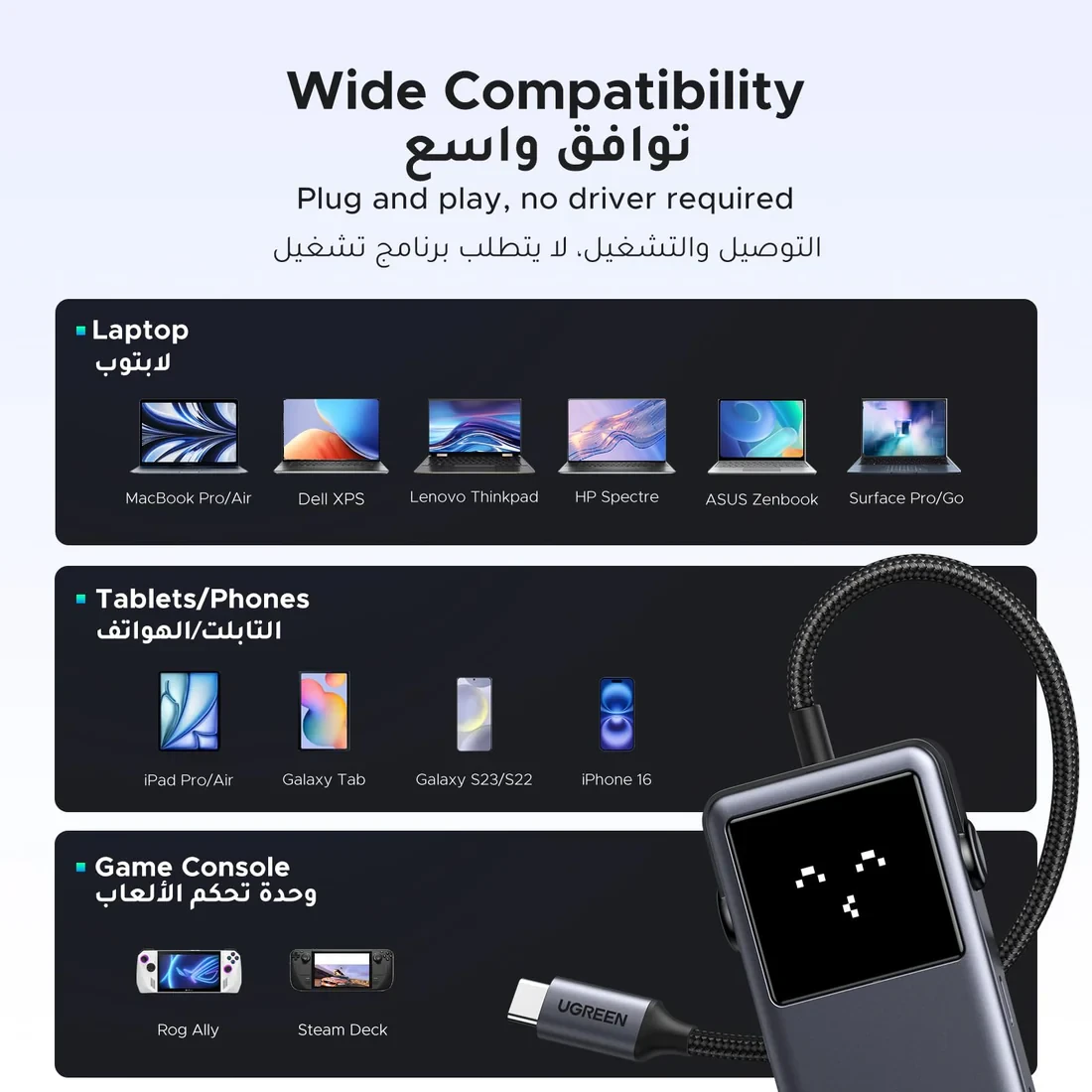 Also compatible with keyboard, mouse, external monitors, 4K projectors, TVs, and portable displays.