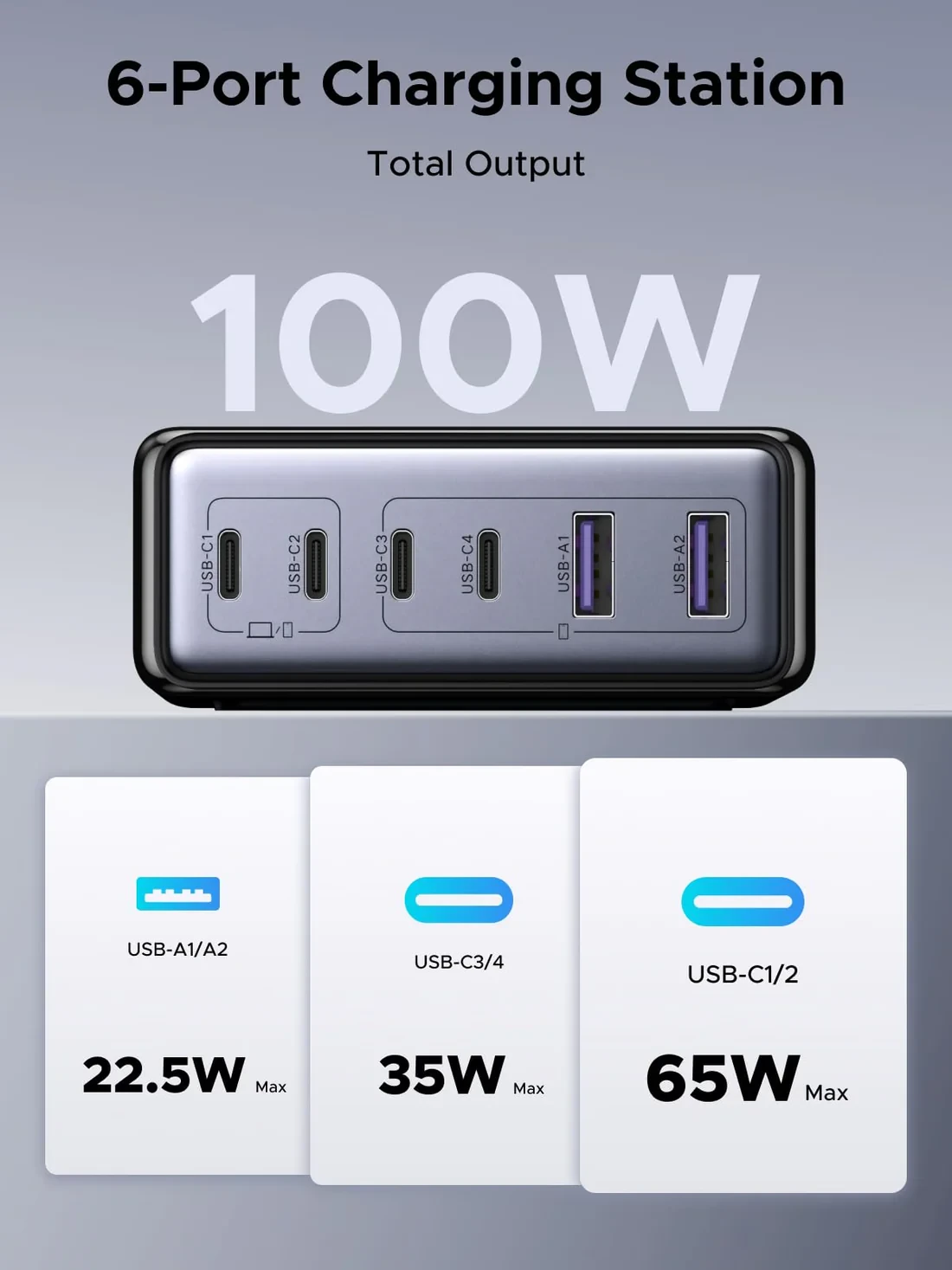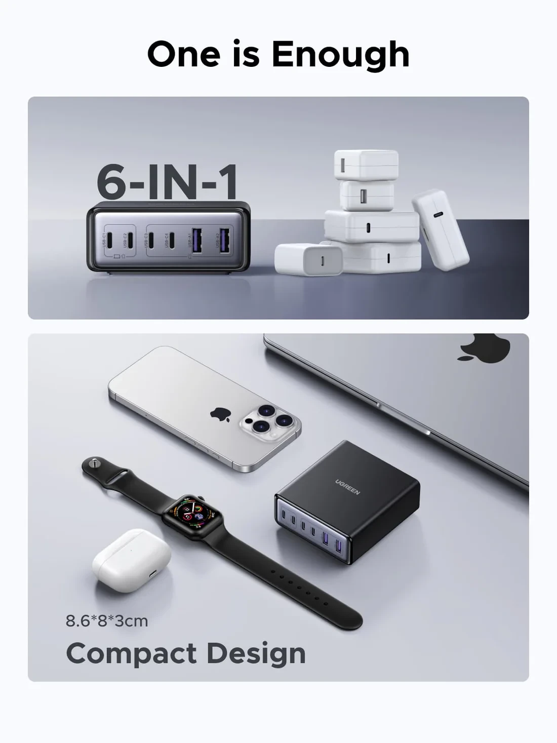 Upgrade your workspace with the UGREEN 100W GaN Charging Station, a powerful 6-in-1 desktop charger designed to charge multiple devices simultaneously. Featuring 4 USB-C ports and 2 USB-A ports, this compact charging hub delivers up to 100W total output, making it perfect for charging MacBooks, smartphones, tablets, and other USB devices efficiently.