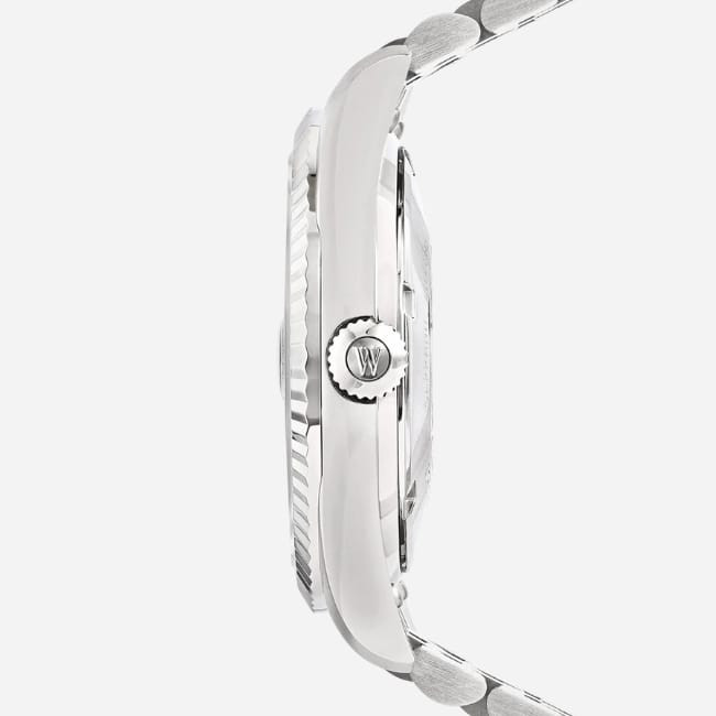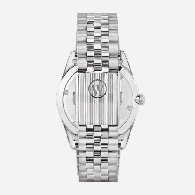 The West End The Classics Automatic Watch is a Swiss-made men’s wristwatch designed with a 41 mm Everbright® stainless steel case and matching bracelet. The corrosion-resistant construction is paired with a maroon sunray dial featuring sleek hour markers, a signature logo, and a date window for everyday timekeeping. A flat sapphire crystal with date magnification protects the dial while maintaining clarity.