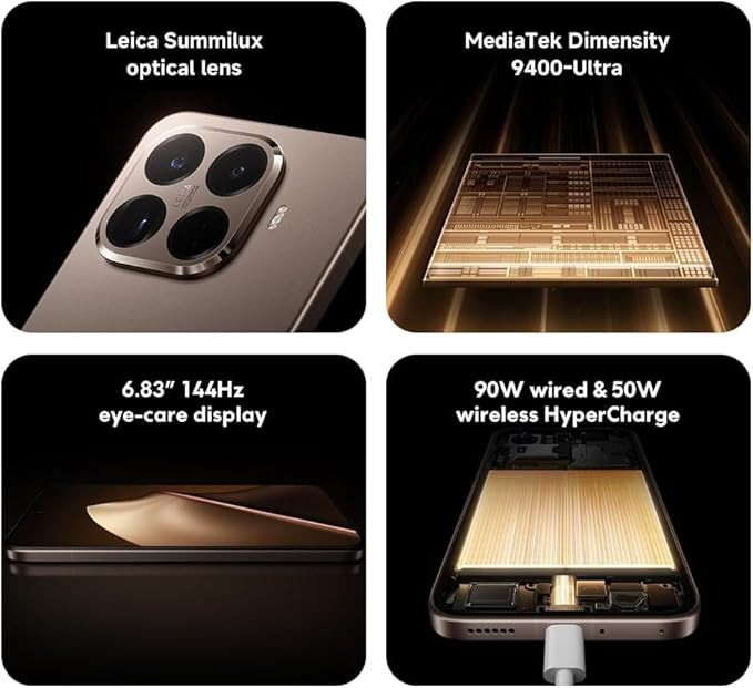 For photography, the phone includes a Leica Summilux optical lens system with triple rear cameras for detailed shots in different conditions. A large 5500mAh (typ) battery supports extended usage, and fast charging capabilities include 90W wired and 50W wireless HyperCharge for quick power top-ups. The device supports Dual SIM 5G connectivity and runs Android for a modern smartphone experience.