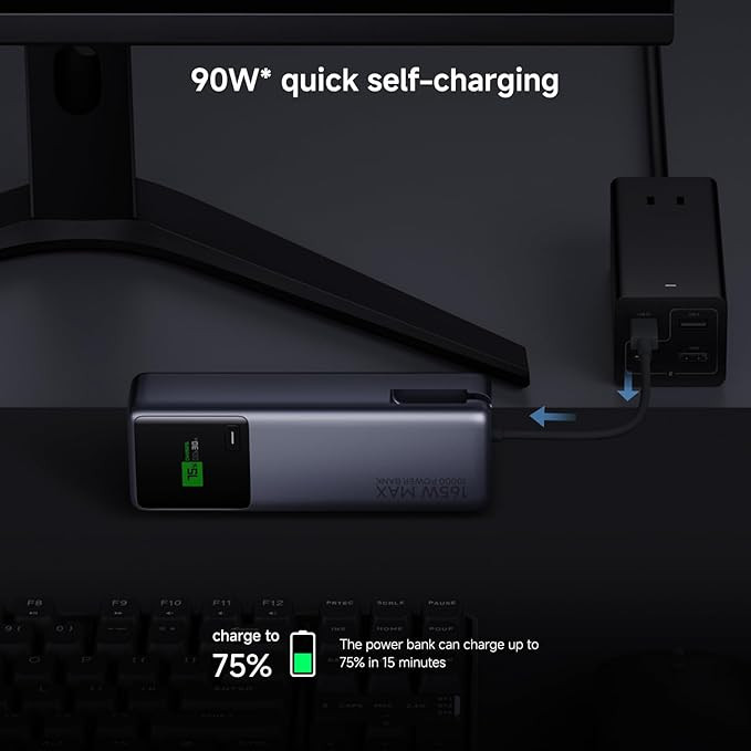 This power bank supports fast input charging of up to 90W, allowing the battery to reach approximately 55 percent charge in around 15 minutes under compatible conditions. An integrated LED display provides clear, real-time information on charging status and power levels. The internal safety system includes overvoltage protection and temperature regulation, supporting stable operation during high-speed charging sessions.