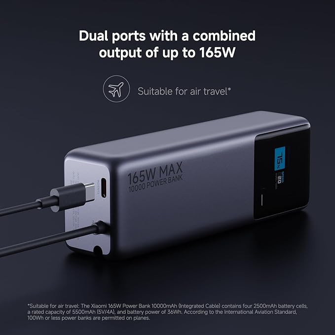 The Xiaomi 165W Power Bank is designed for ultra-fast portable charging with a compact and travel-friendly form factor. It features a 10000mAh battery capacity and supports a maximum output of up to 165W, making it suitable for charging a wide range of devices, including smartphones, tablets, and compatible laptops. The built-in USB C cable allows direct charging without the need for additional accessories, supporting convenient everyday use.