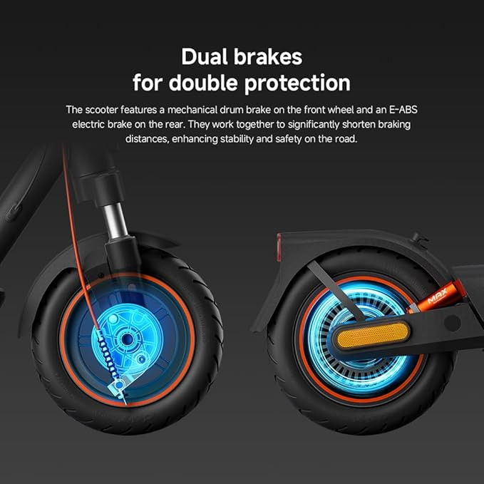 Built with a high-strength carbon steel frame, the scooter is engineered to support a maximum load of up to 120 kg. A double suspension system, consisting of a hydraulic front suspension and rear dual suspension, helps reduce road impact and improves ride comfort on uneven surfaces. The 10-inch tubeless tires are designed to enhance traction, stability, and riding confidence across different road conditions.