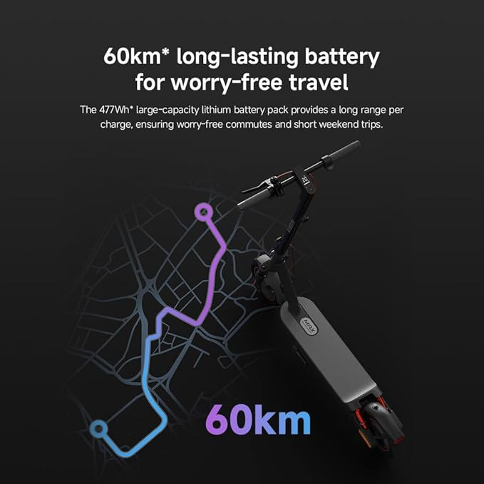 The Xiaomi Electric Scooter 5 Max GL is designed for long-range urban commuting with a focus on stability, safety, and controlled performance. It supports a maximum speed of up to 25 km/h and delivers a riding range of up to 60 kilometers on a single charge, making it suitable for daily travel and extended city rides. The scooter is powered by a rear-wheel drive motor with a maximum output of up to 1000W, enabling smooth acceleration and supporting incline climbing up to 22 percent.