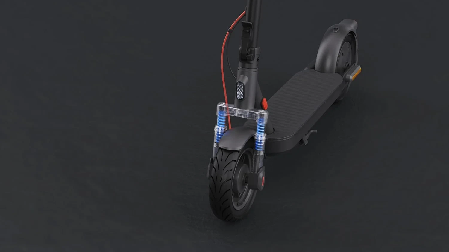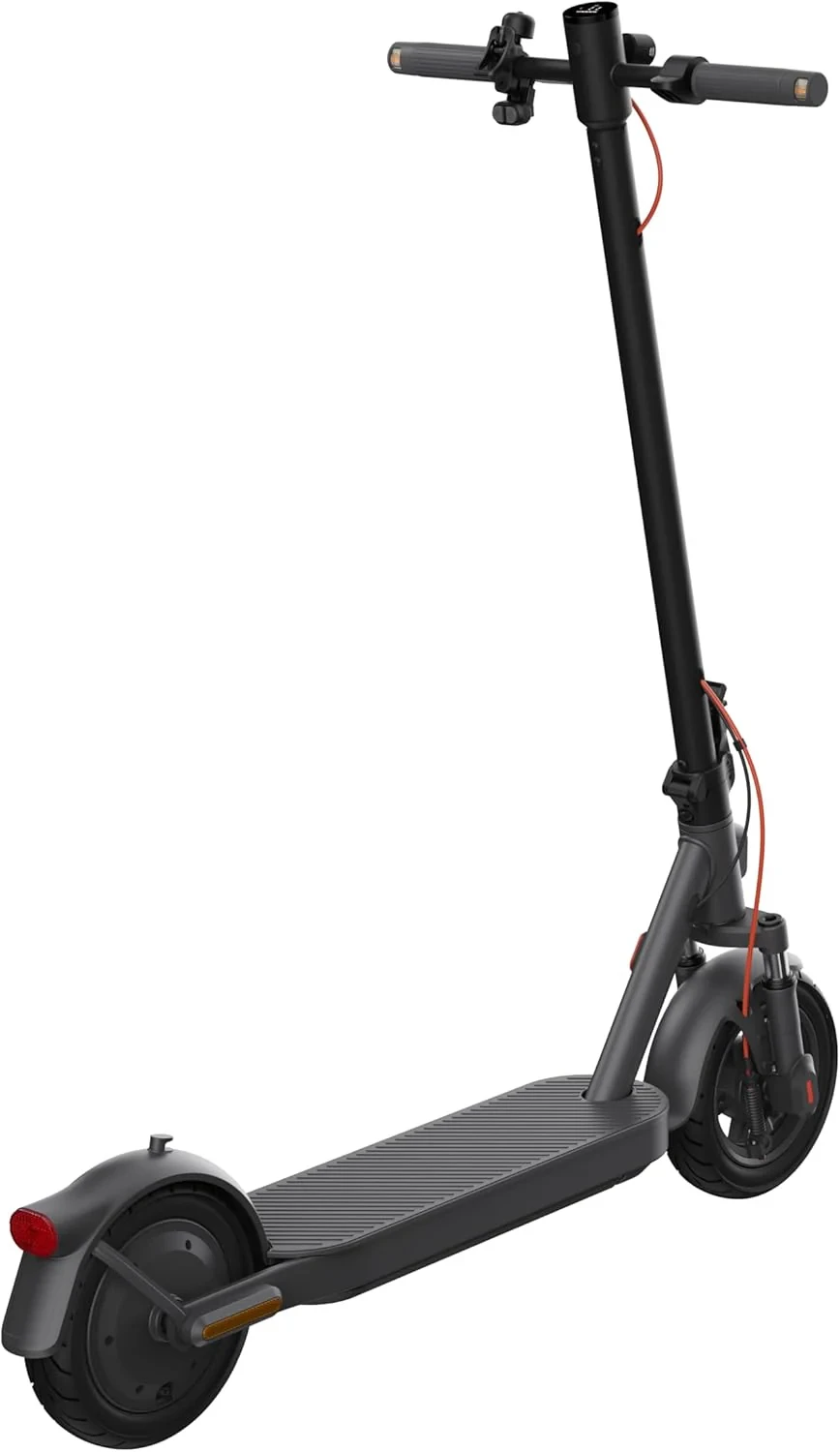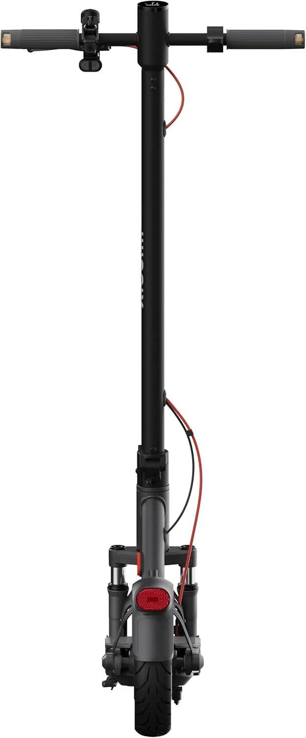 To improve comfort on uneven roads, the scooter is equipped with a high-performance front dual-spring suspension system offering approximately 30 mm of shock absorbency. The 10-inch low rolling-resistance tubeless tires provide improved grip and stability compared to smaller wheel designs, helping maintain smoother handling across varied urban surfaces. The scooter supports climbing angles of up to 20 percent, allowing confident riding on inclines.