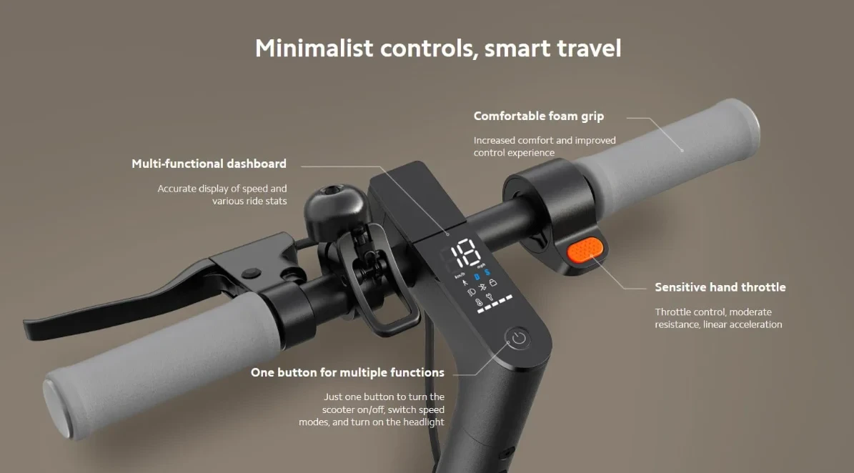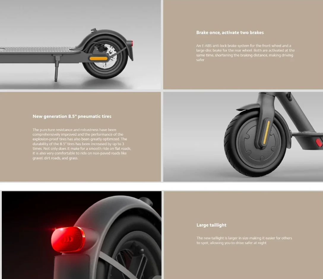 For safety and ride comfort, the Mi Electric Scooter 1S features a dual braking system with a front E-ABS anti-lock brake and a rear disc brake to support controlled stopping. The 8.5-inch pneumatic tires are designed to absorb shocks and reduce slipping on different road surfaces. Extra-thick handlebar grips provide improved comfort during use, while the minimalist design supports easy handling for everyday riders.
