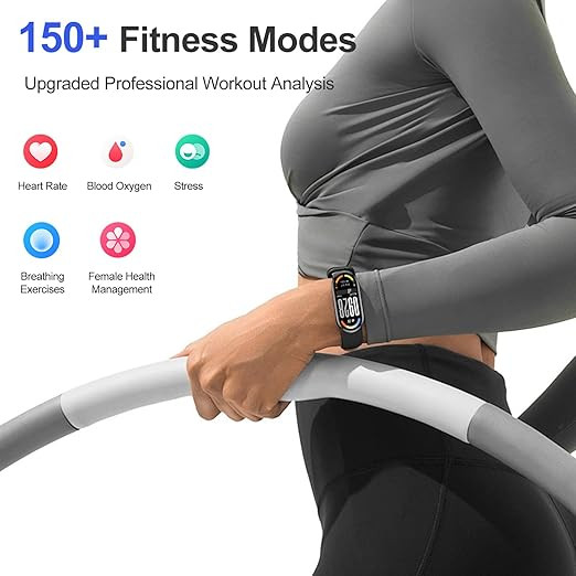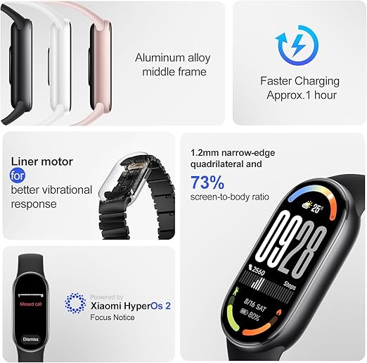 This smart band supports over 150 sports modes, allowing users to track a wide range of physical activities with detailed performance data. It offers 24 hour heart rate monitoring, SpO₂ tracking, and sleep analysis to help users better understand their overall wellness and daily habits. The device operates on HyperOS 2, supporting smooth system performance and stable connectivity with compatible smartphones.