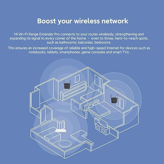 The Mi Wi-Fi Range Extender Pro is designed to expand wireless network coverage and reduce signal dead zones in homes and small offices. It works as a WiFi repeater and network expander, compatible with routers from Xiaomi and other brands. The plug-and-play design allows quick setup without complex configuration.