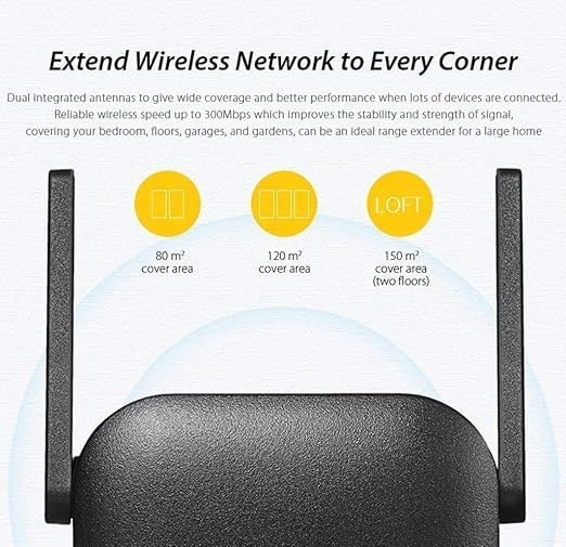 This range extender is equipped with two high-gain external antennas to provide wider coverage and improved signal stability. It supports wireless speeds of up to 300 Mbps and is suitable for everyday internet activities such as browsing, streaming, and online communication. Network management and basic configuration can be handled through the Xiaomi Mi WiFi app, offering convenient control from a smartphone.