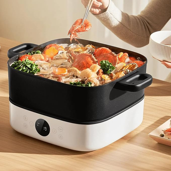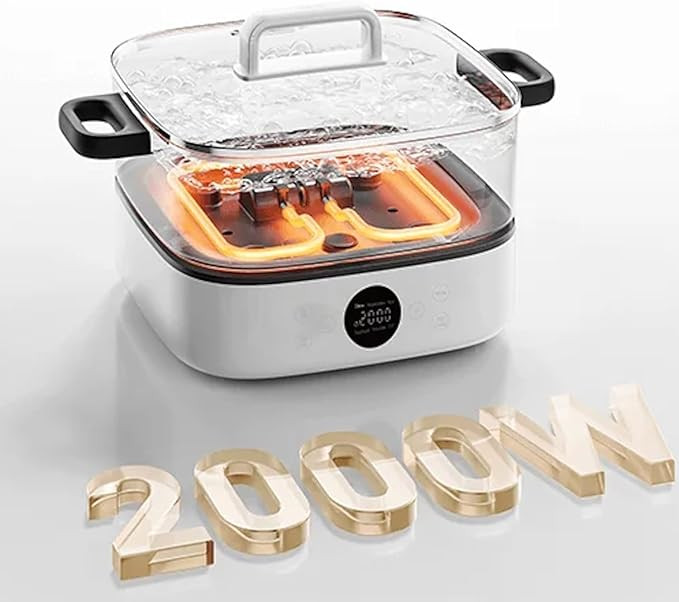 This cooker operates on a low-power electrical system designed for safe and controlled heating. The stainless steel interior supports consistent heat distribution and is suitable for frequent food contact. Its multifunctional design allows it to be used for hot pot cooking and similar meal preparations that require steady heating over time.
