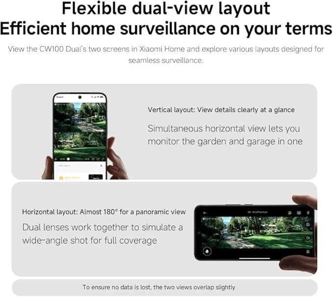 The Xiaomi Outdoor Camera CW100 Dual UK is designed for outdoor security monitoring with a dual-lens camera system for expanded coverage. It features two 3MP cameras that work together to capture detailed video from multiple perspectives, helping reduce blind spots around outdoor areas. The camera supports smart full-color night vision, allowing clearer visibility in low-light conditions while maintaining color detail during nighttime monitoring.