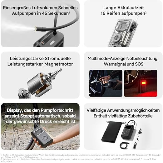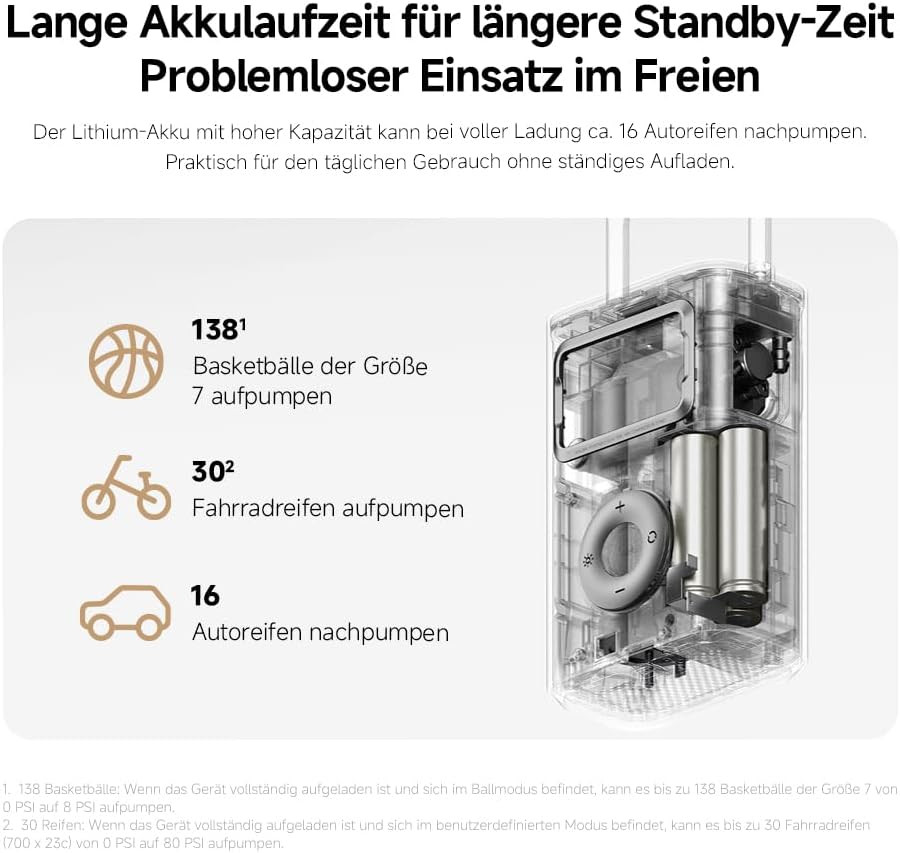 The device is supplied with multiple accessories to support different valve types, including adapters for bicycles and sports equipment. Its lithium-ion battery supports extended use between charges, and the Type-C charging interface allows convenient recharging. The durable plastic housing and balanced weight make it suitable for regular automotive and personal use.