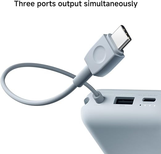 In addition to the built-in cable, the power bank includes USB and USB-C output ports, enabling multiple devices to be charged at the same time. With a maximum output of 22.5W, it supports fast charging for compatible devices. The slim and lightweight design makes it easy to carry in a pocket or bag, while the durable exterior is intended for regular daily handling.