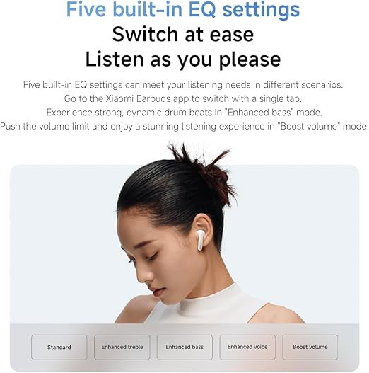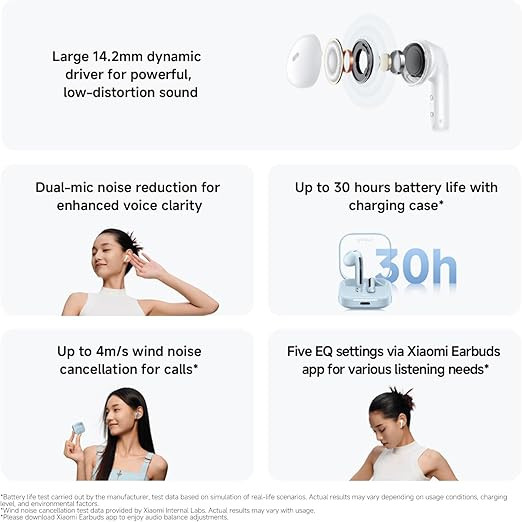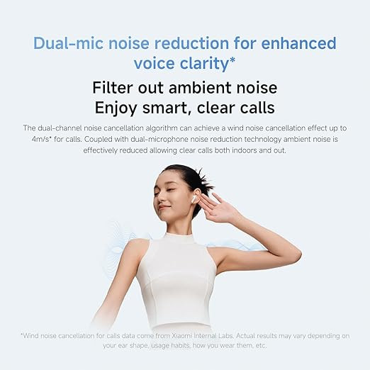 These earphones are equipped with a 14.2 mm dynamic driver that supports deep bass and balanced sound output. Audio tuning from the Xiaomi Acoustic Laboratory enables multiple EQ styles through the companion app. Dual microphones with AI-assisted noise reduction are designed to help improve call clarity by reducing background noise during voice calls.