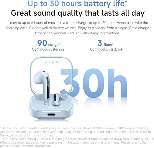 The Xiaomi Redmi Buds 6 Active offer extended battery performance, delivering up to 6 hours of playback on a single charge and up to 30 hours of total usage when combined with the charging case. Fast charging support and a USB Type C charging interface provide convenient recharging. The earbuds are designed for everyday use and support water resistance for added durability.