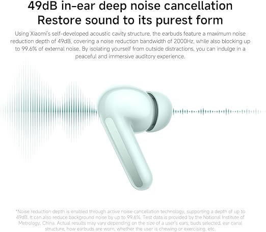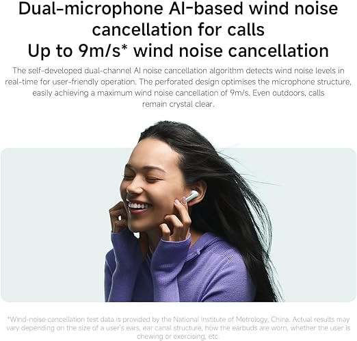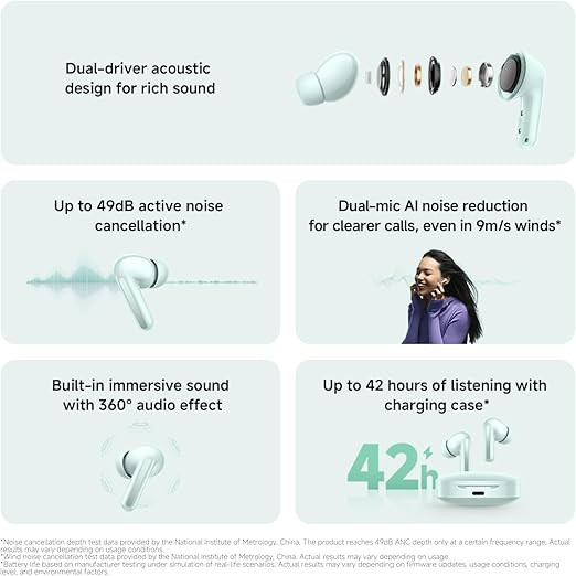 These earbuds include active noise cancellation of up to 49 dB across a wide frequency range, with multiple ANC modes designed for different environments. Personalized ANC automatically adapts performance based on how the earbuds are worn. Dual microphones with AI noise reduction are integrated to help improve call clarity by reducing background and wind noise during voice communication.