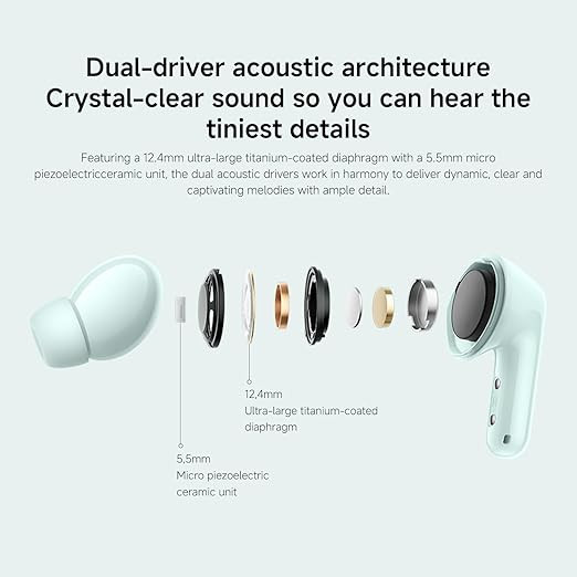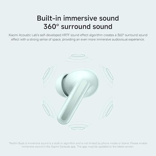 The Redmi Buds 6 are in-ear wireless earbuds designed to deliver balanced Hi-Fi sound and effective noise control for everyday listening. They feature a dual-driver acoustic setup combining a 12.4 mm bass driver with a 5.5 mm micro piezoelectric ceramic tweeter, engineered to provide clear highs, defined mids, and controlled low frequencies. The earbuds support immersive sound and multiple EQ presets to suit different listening preferences.