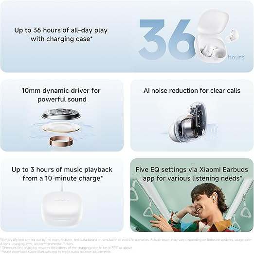 The Redmi Buds 6 Play are in-ear wireless headphones designed for everyday listening with a compact and lightweight form. Each earbud weighs approximately 3.6 g, helping reduce pressure in the ear canal during extended use. The earbuds feature a 10 mm dynamic driver tuned by the Xiaomi Acoustic Lab to deliver balanced audio output across different listening scenarios. Five preset EQ modes are available to adjust sound output based on user preference.