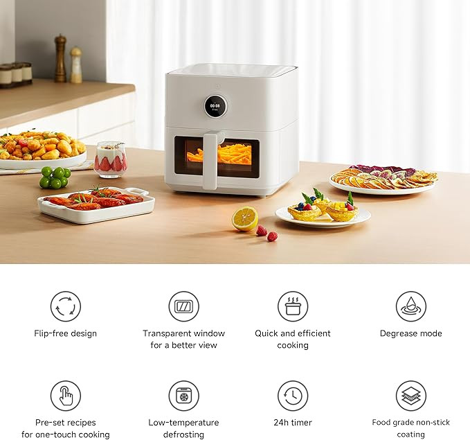 With a 5.5L basket capacity, the appliance is suitable for family-sized portions and can accommodate larger ingredients such as a whole chicken. The built-in degrease mode helps reduce excess fat during cooking, and the digital interface supports one-touch operation with preset programs. When connected to the Mi Home or Xiaomi Home app, users can access additional recipes and monitor cooking progress directly from a smartphone.