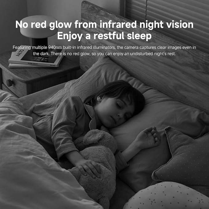 The camera supports full-colour recording in low-light conditions using advanced image processing and sensitive built-in sensors. Infrared night vision with 940nm illuminators enables clear nighttime monitoring without visible red light, supporting undisturbed indoor use. AI-powered human detection and sound detection functions help identify relevant activity while reducing unnecessary alerts through local processing algorithms.